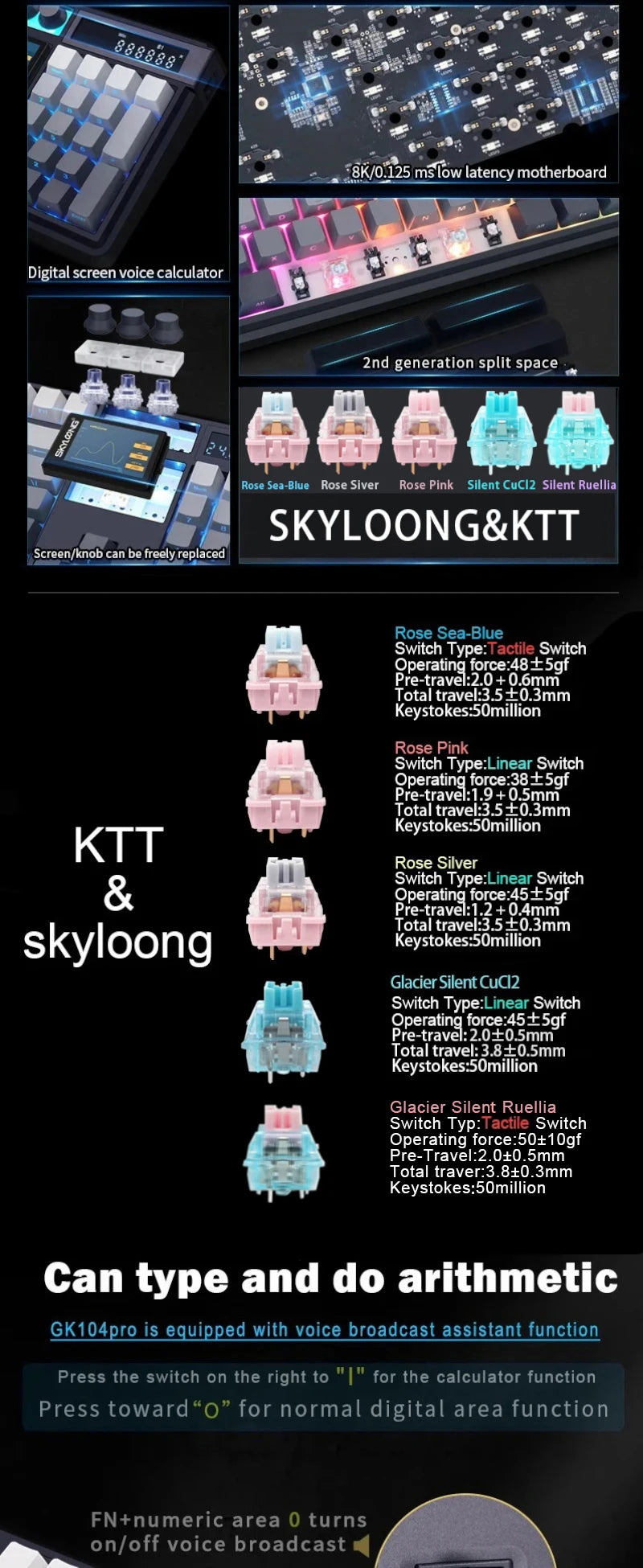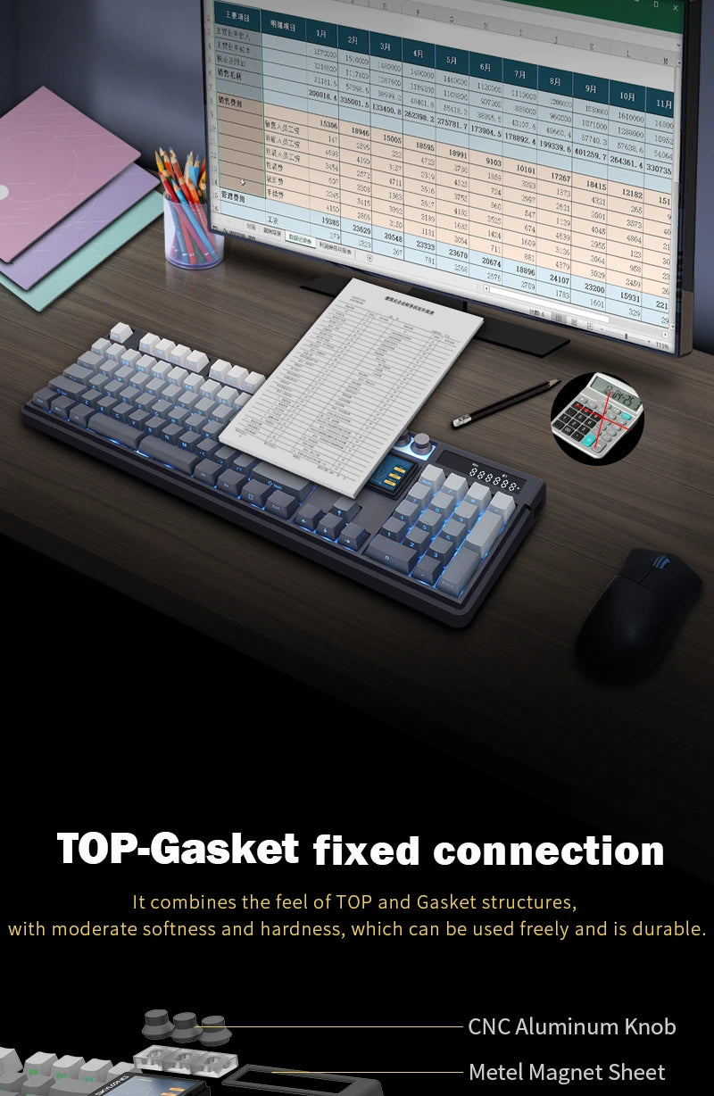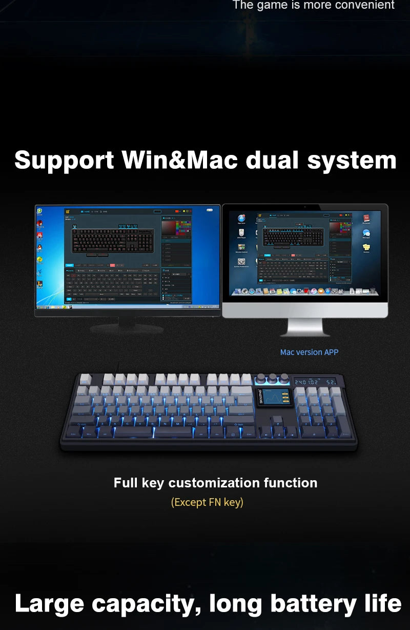 Equipped with a built-in digital display and a 2.0-inch LCD screen (320×240), the keyboard shows battery, connection status, date, and more. It also supports image and animation uploads (<15MB), typing speed tests, and calculator functions for added convenience.