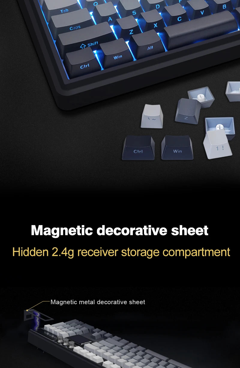 GK104 Pro supports Bluetooth 5.1, 2.4GHz wireless, and USB-C wired connections, allowing seamless switching between PC, laptop, tablet, and phone. Powered by a high-performance Nordic chip with up to 8000Hz polling rate and ultra-low latency (0.125ms), it delivers smooth performance for gaming and multitasking. The 8000mAh battery ensures long-lasting use.