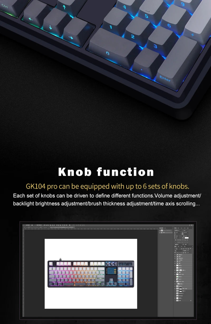 GK104 Pro mechanical keyboard features a durable ABS/PBT build with an ANSI (QWERTY) layout and RGB south-facing backlight for a modern setup.