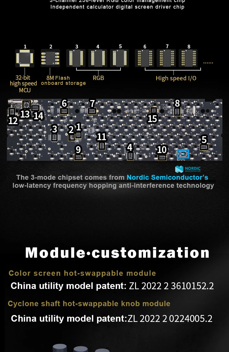 Equipped with a V3.0 screen (320 × 240 resolution, supports images under 15MB) and full hot-swappable support, including knobs and switches.